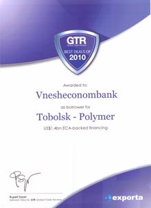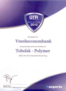 The British Global Trade Review Magazine awarded the Best Deal of the Year 2010 award to State Corporation ‘Bank for Development and Foreign Economic Affairs (Vnesheconombank)’. The Magazine rated highly Vnesheconombank’s efforts to arrange financing for Russia’s modern largest propylene integrated plant construction project in the city of Tobolsk.