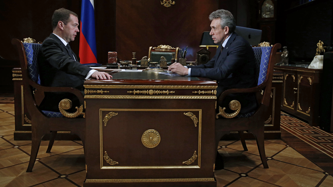 Russian Prime Minister Dmitry Medvedev holds a working meeting with Vnesheconombank Chairman Sergei Gorkov