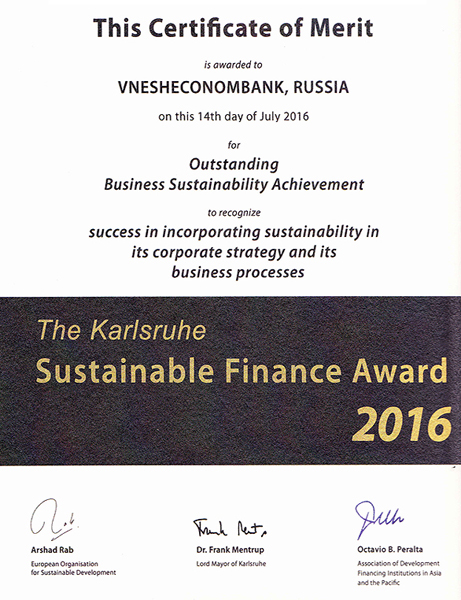 Vnesheconombank has become the winner of the global awards run by the Association of Development Financing Institutions in Asia and the Pacific (ADFIAP) and the European Organization for Sustainable Development (EOSD). The Bank was honored for its Sustainability Roadmap in the category of Outstanding Business Sustainability Achievement.