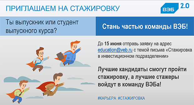 С 1 июля ВЭБ открывает свои двери для выпускников вузов и студентов выпускных курсов. В рамках 4-месячной программы они смогут пройти стажировку в инвестиционных подразделениях банка.
