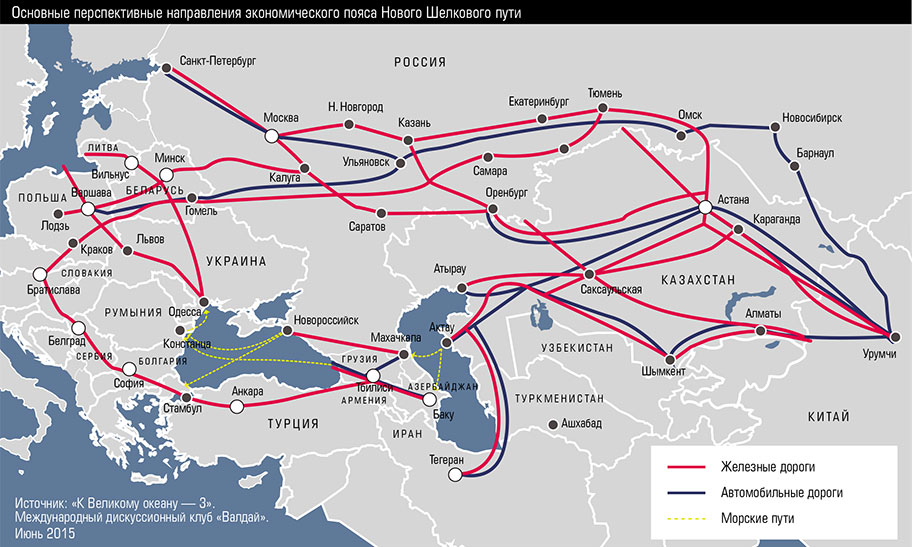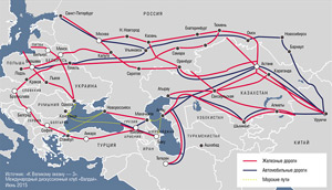 Одна из сухопутных составляющих Шелкового пути, автомагистраль Европа — Западный Китай, находится в высокой степени готовности с восточной стороны: строительство своих участков магистрали в нынешнем году завершает Китай (общей протяженностью 3500 км), в 2016-м — Казахстан (2700 км), а вот состояние дел на российском участке трассы (она пройдет через Оренбургскую область, Башкирию, далее на Казань, Москву и Санкт-Петербург, общая протяженность в РФ 2200 км.) пока разочаровывает. Отдельные регионы за свой счет проводят изыскательские работы и трассировку магистрали, но на федеральном уровне проект пока заморожен в связи с кризисом, несмотря на обязывающие документы, подписанные нашей страной по этому проекту еще в 2007 году.