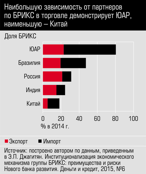 Объединение БРИКС, долгое время функционирующее как форум пяти крупных, динамичных стран с развивающимся рынком, в последние годы стал приобретать черты экономического блока. В июле прошлого года на саммите БРИКС в Бразилии был подписан целый ряд документов принципиальной значимости, включая Меморандум о взаимопонимании и сотрудничестве между экспортно-кредитными агентствами стран БРИКС, Соглашение о сотрудничестве в области инноваций, Договор о создании Пула условных валютных резервов стран БРИКС, а также Соглашение о создании Нового банка развития БРИКС (НБР). Последнее уже ратифицировано Россией, Бразилией и Индией. ЮАР и КНР планируют завершить эту работу до конца июня.