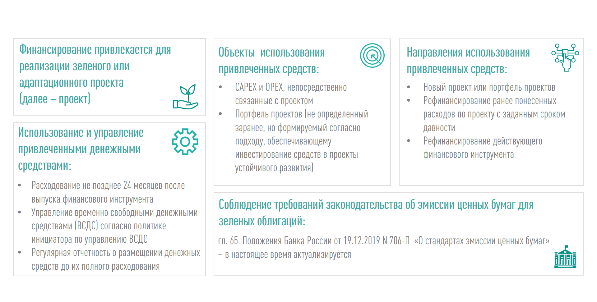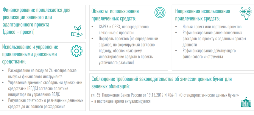 - план по использованию всех привлеченных денежных средств на цели, связанные с финансированием и (или) рефинансированием проекта устойчивого развития;